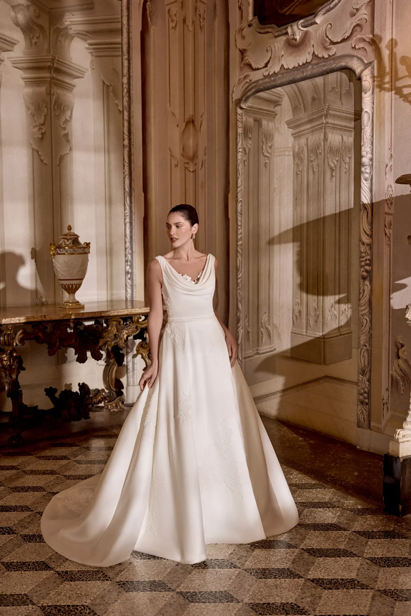 Mikado Ball Gown with Cowl Peek-A-Boo Neckline and Illusion V-Back